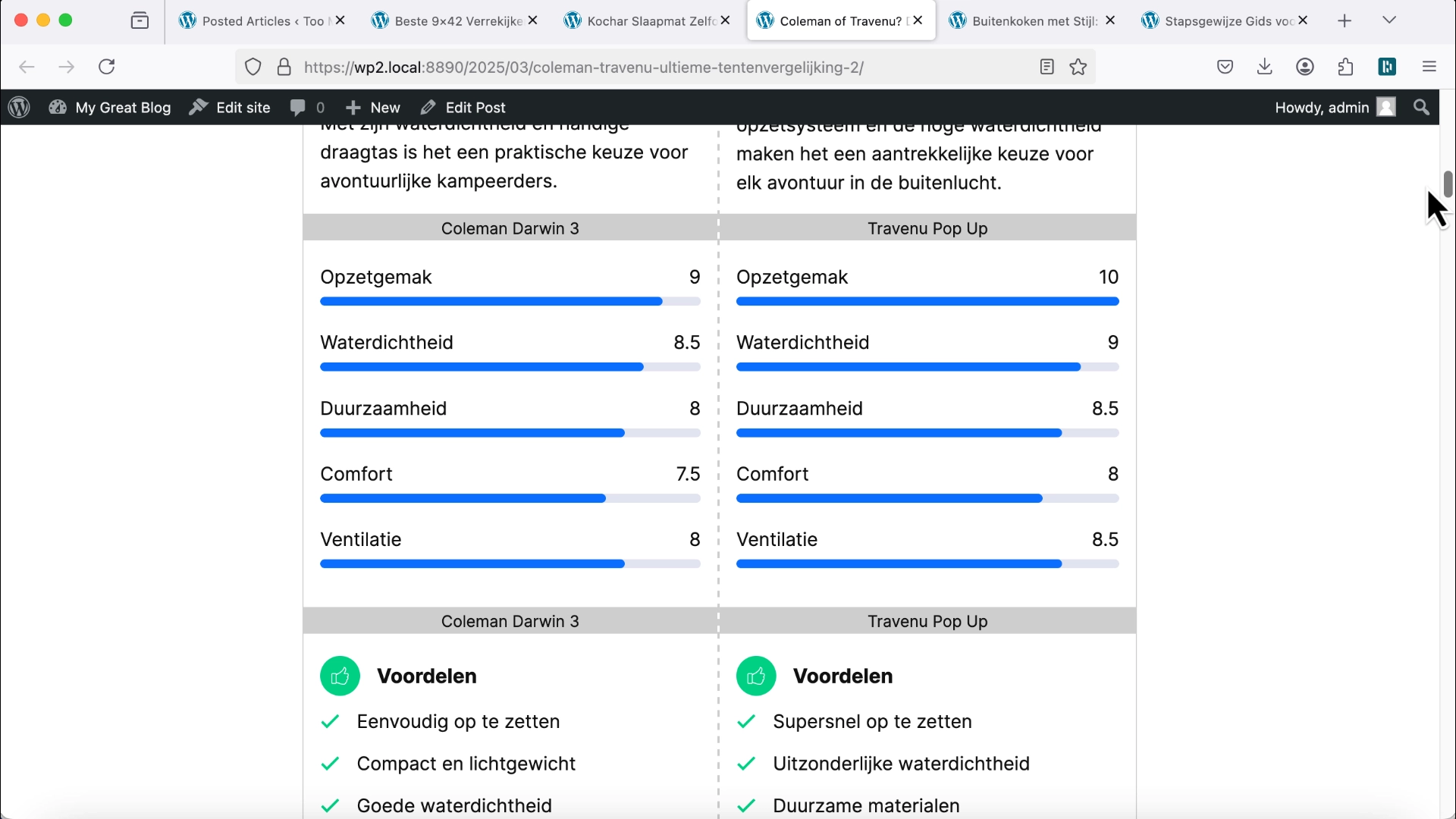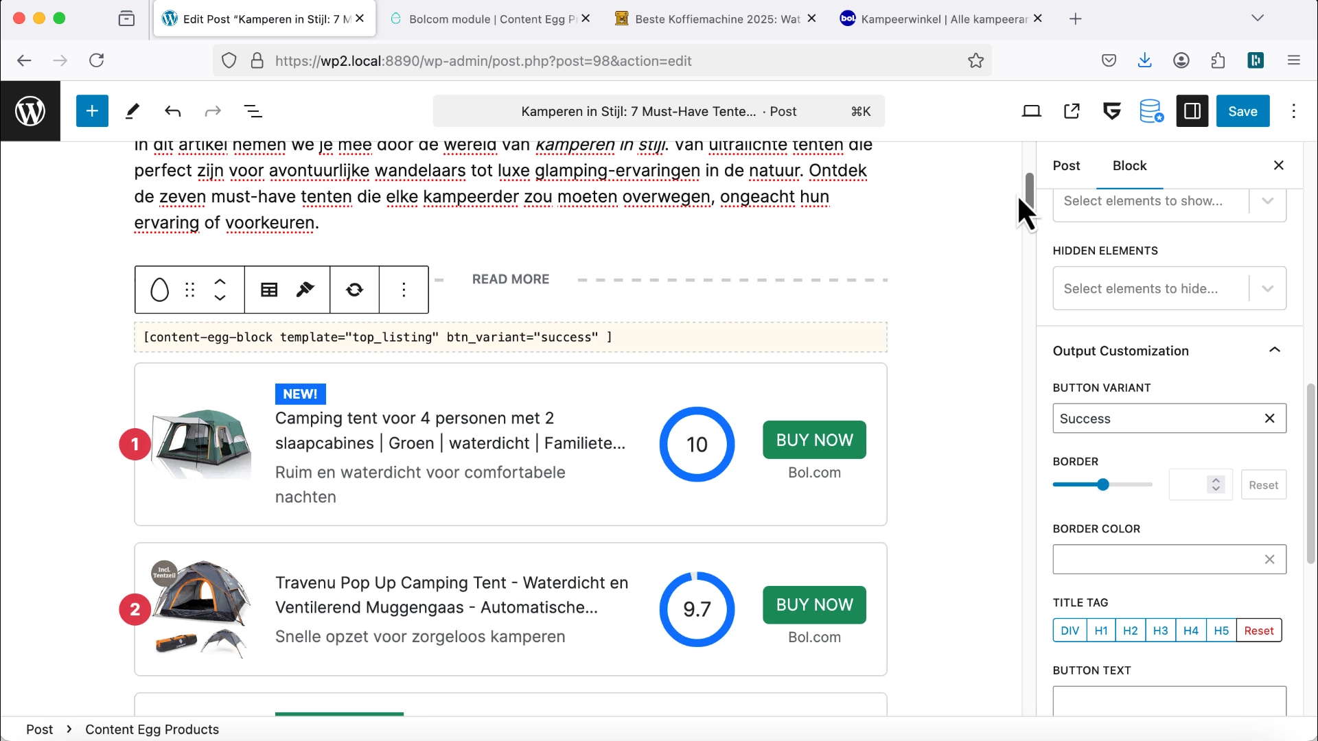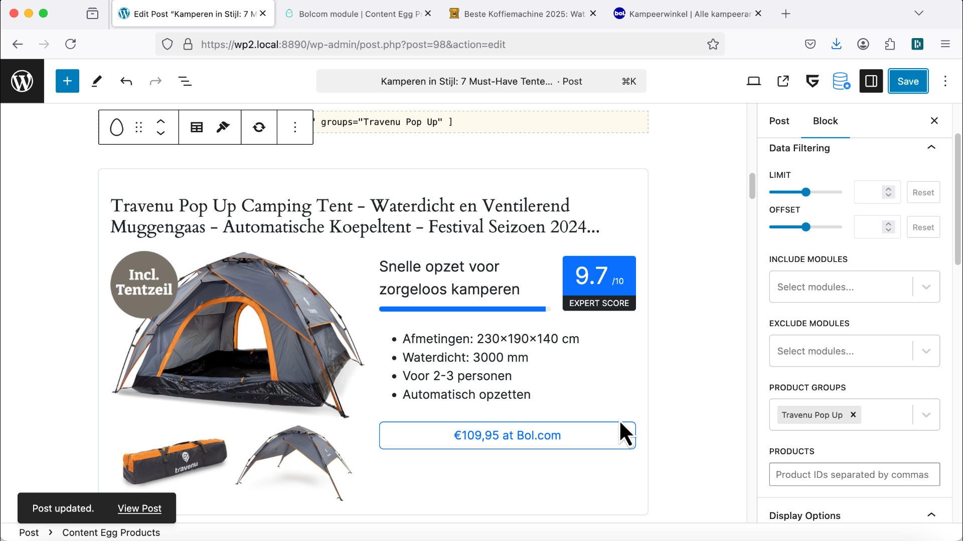 When you insert the Content Egg Products block, you can choose from several templates in the editor (via a dropdown or the sidebar). For example, if you select the “Product Card” template for the tent niche, each model will appear as an individual card with its image, name, optional bullet points, price or rating, and a “Bekijk nu” (“View now”) button linking directly to Bol.com. If you choose a “Top List” template instead, the products will be displayed in a clean numbered list, with the option to highlight one as “Onze keuze” (“Our pick”), similar to the style often seen on comparison websites.