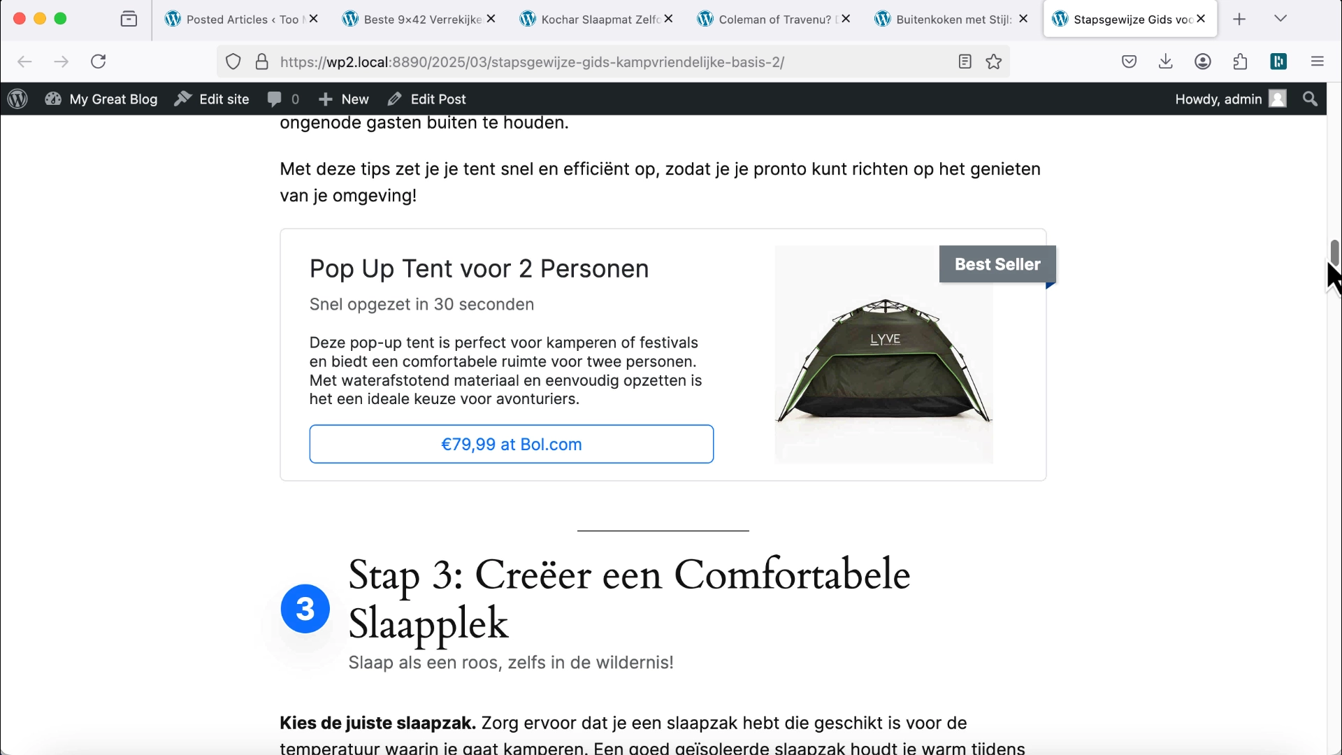 • For each article, use Content Egg to find relevant products (for example, if it’s writing “5 Best Espresso Machines for Home Use”, it will query the Bol.com module for top espresso machines and select a handful to include).